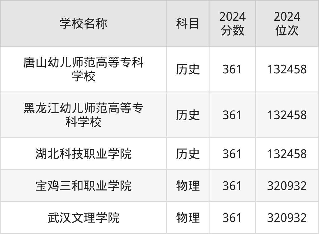 其中,物理组361分位于陕西的学校有宝鸡三和职业学院。历史组361分位于河北的学校有唐山幼儿师范高等专科学校。