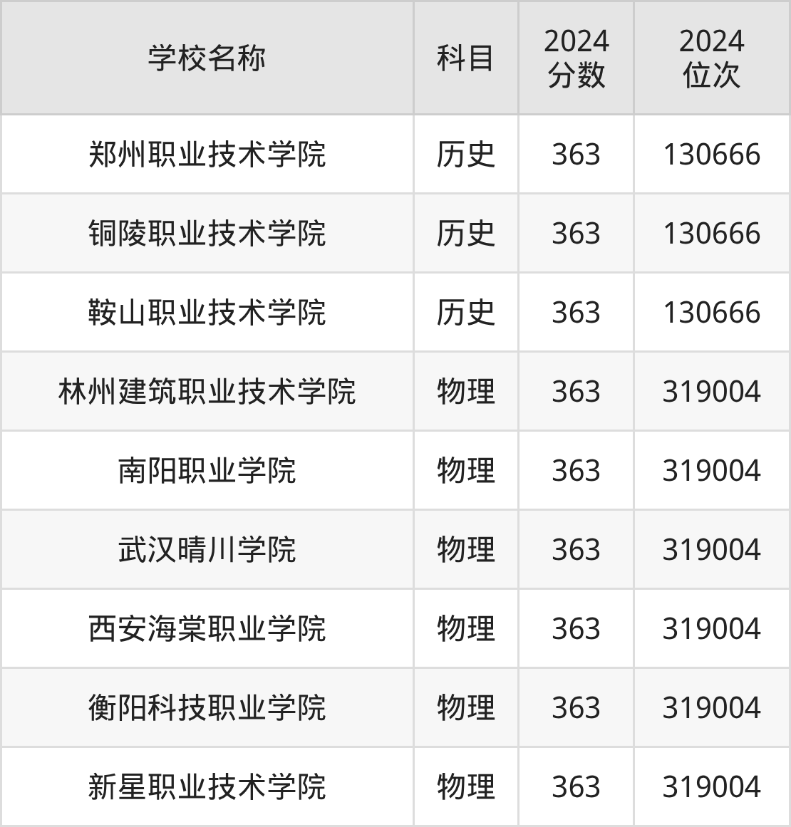 其中,物理组363分位于河南的学校有林州建筑职业技术学院。历史组363分位于河南的学校有郑州职业技术学院。