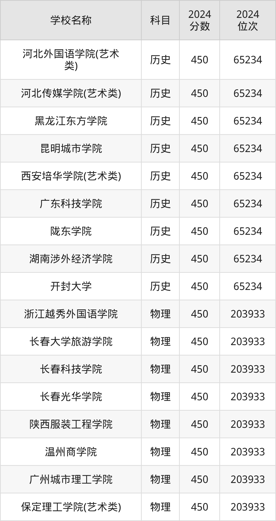 回看2024年河北高考最低分为450分的文科大学名单,物理组有8条数据,历史组有9条数据。