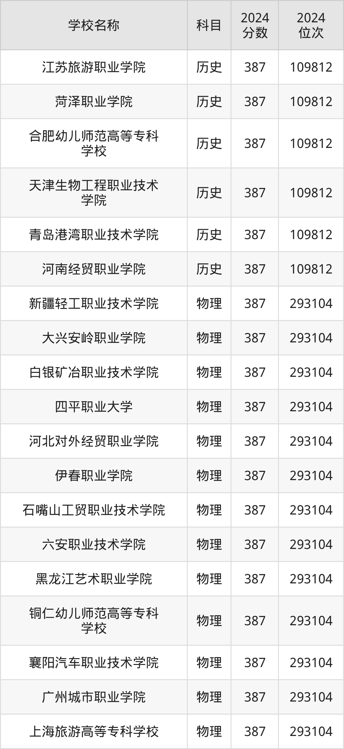 | 阜阳职业技术学院 | 物理 | 387 | 250277 |