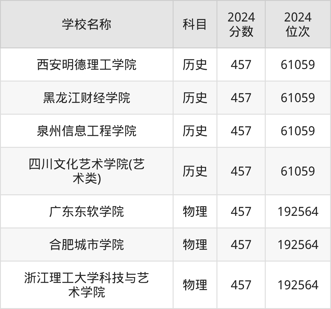 其中,物理组457分位于广东的学校有广东东软学院。历史组457分位于陕西的学校有西安明德理工学院。