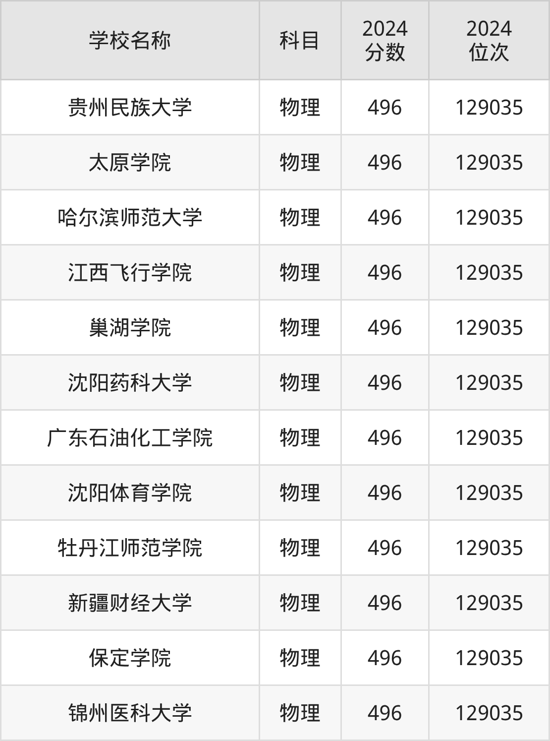 | 吉林体育学院 | 物理 | 496 | 167370 |