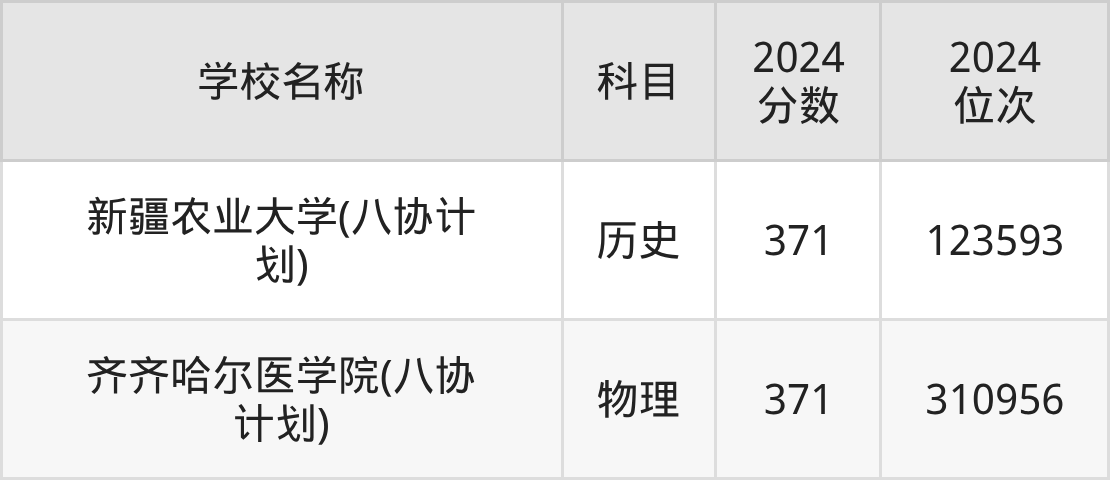 其中,物理组371分位于黑龙江的学校有齐齐哈尔医学院(八协计划)。历史组371分位于新疆的学校有新疆农业大学(八协计划)。