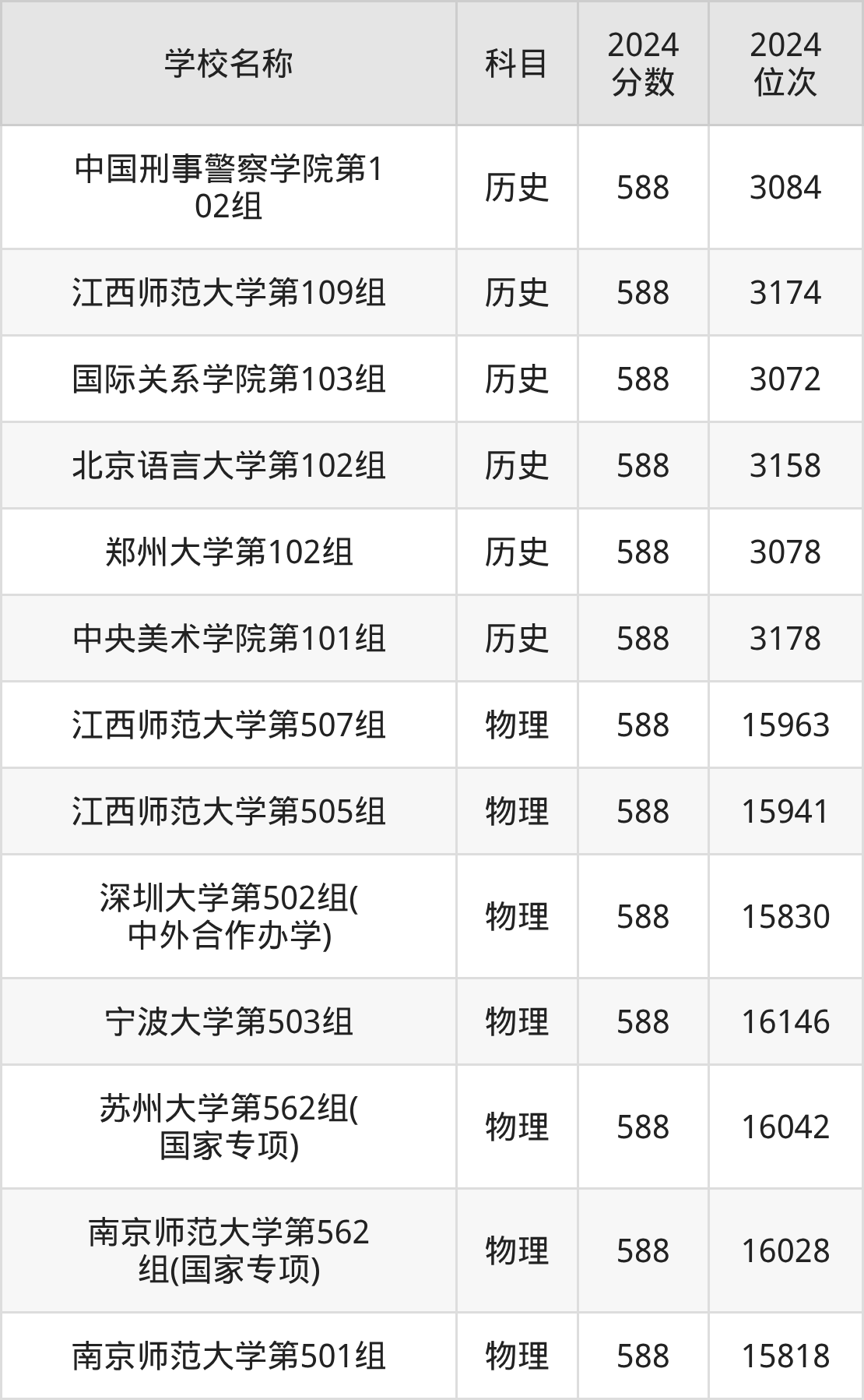 回看2024年江西高考最低分为588分的文科大学名单,物理组有7条数据,历史组有6条数据。