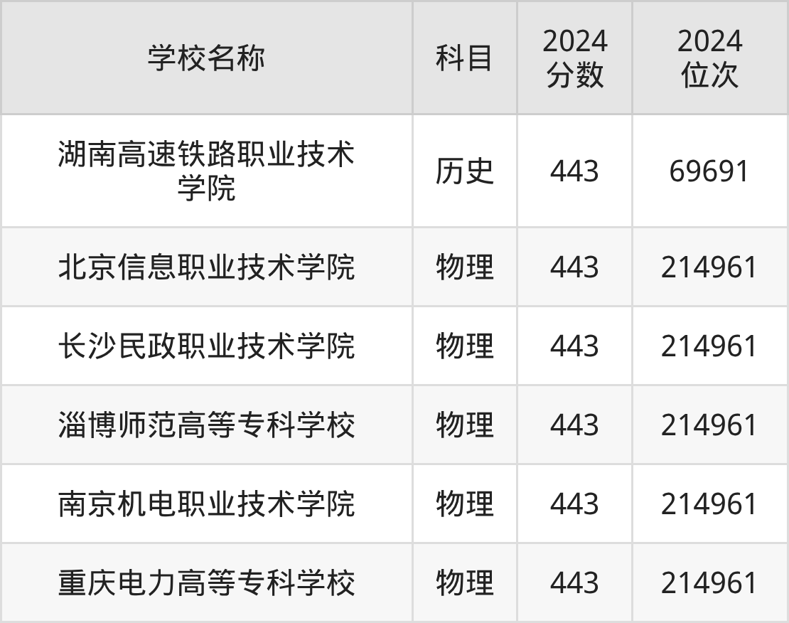 其中,物理组443分位于北京的学校有北京信息职业技术学院。历史组443分位于湖南的学校有湖南高速铁路职业技术学院。