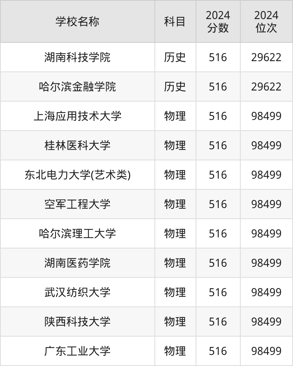 其中,物理组516分位于上海的学校有上海应用技术大学。历史组516分位于湖南的学校有湖南科技学院。