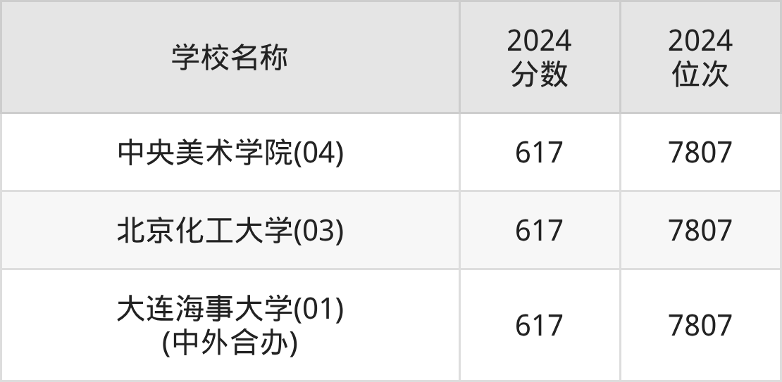 其中,617分位于北京的学校有中央美术学院、北京化工大学。