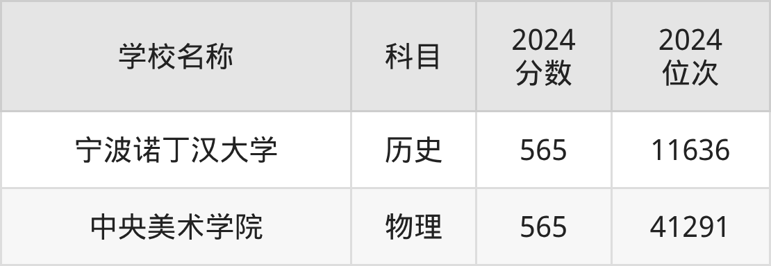 其中,物理组565分位于浙江的学校有中央美术学院。历史组565分位于浙江的学校有宁波诺丁汉大学。