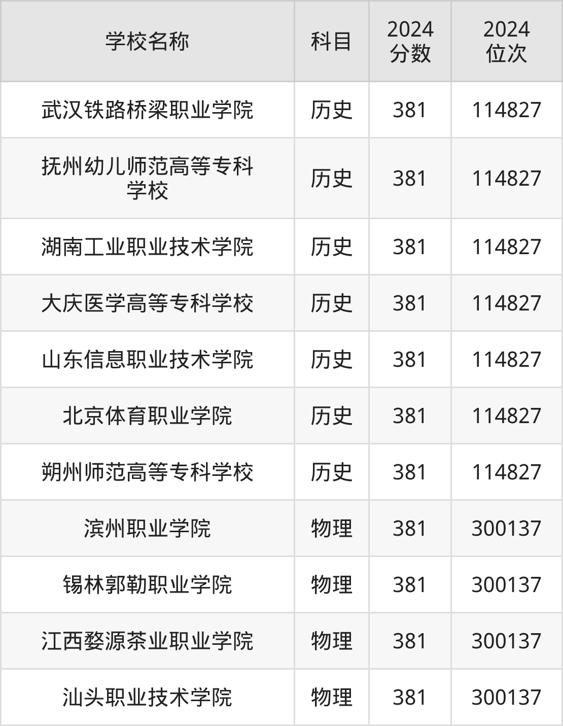 回看2024年河北高考最低分为381分的公办大专学校名单,物理组有4条数据,历史组有7条数据。