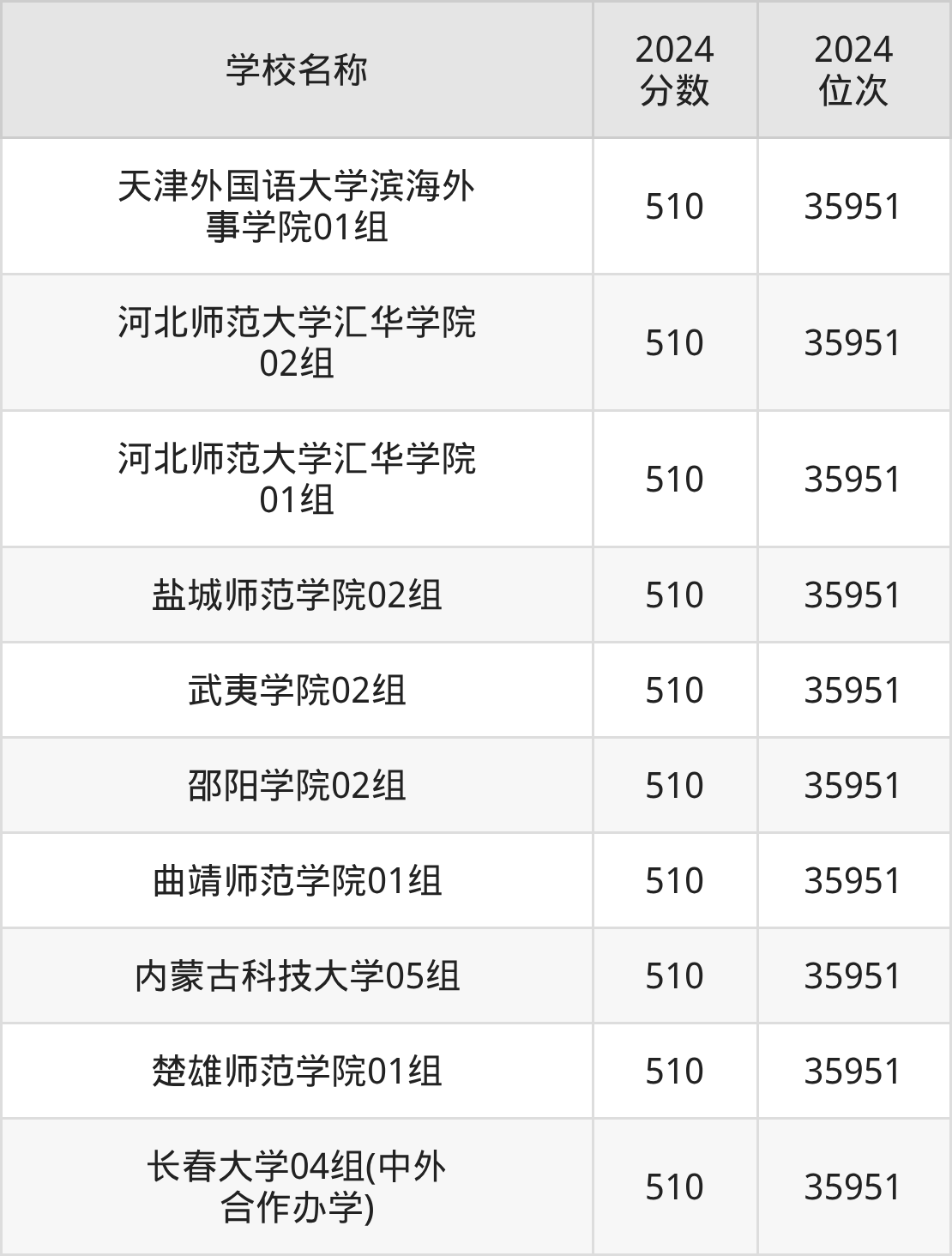 其中,510分位于天津的学校有天津外国语大学滨海外事学院。