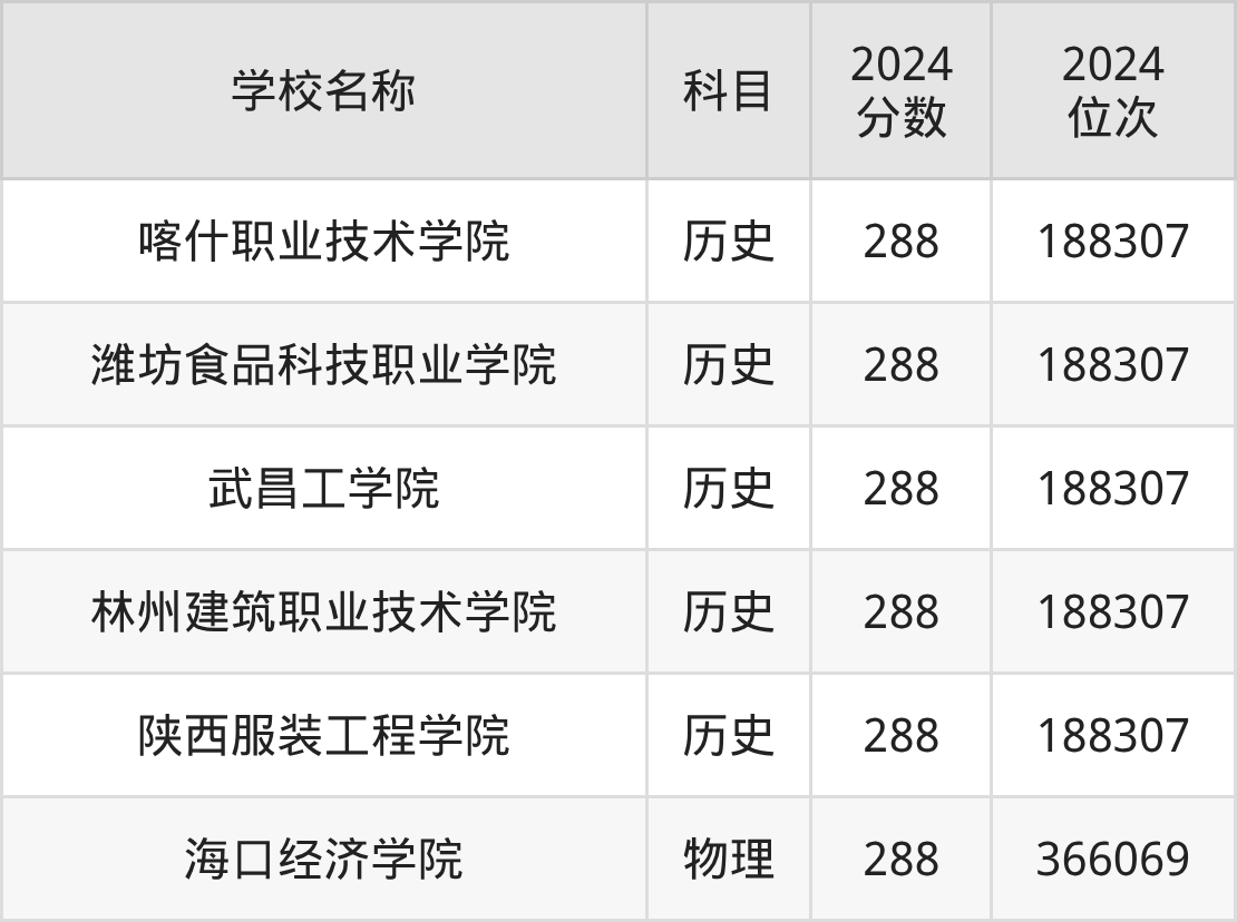 其中,物理组288分位于海南的学校有海口经济学院。历史组288分位于新疆的学校有喀什职业技术学院。