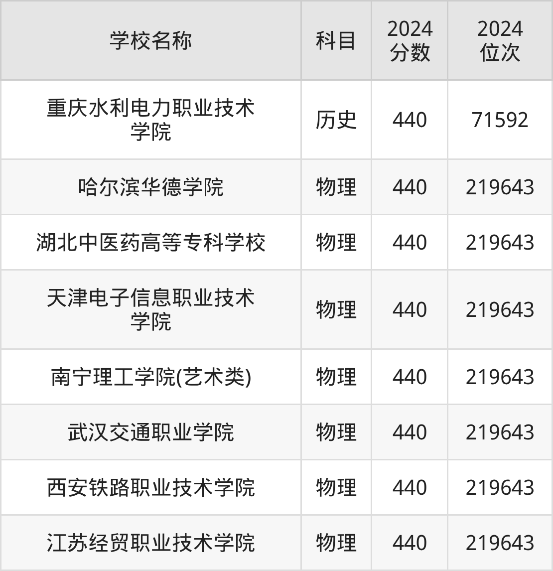 其中,物理组440分位于江苏的学校有江苏经贸职业技术学院。历史组440分位于重庆的学校有重庆水利电力职业技术学院。