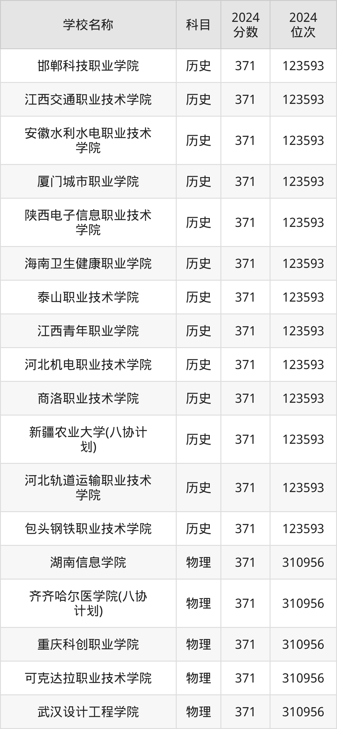 其中,物理组371分位于湖南的学校有湖南信息学院。历史组371分位于河北的学校有邯郸科技职业学院。