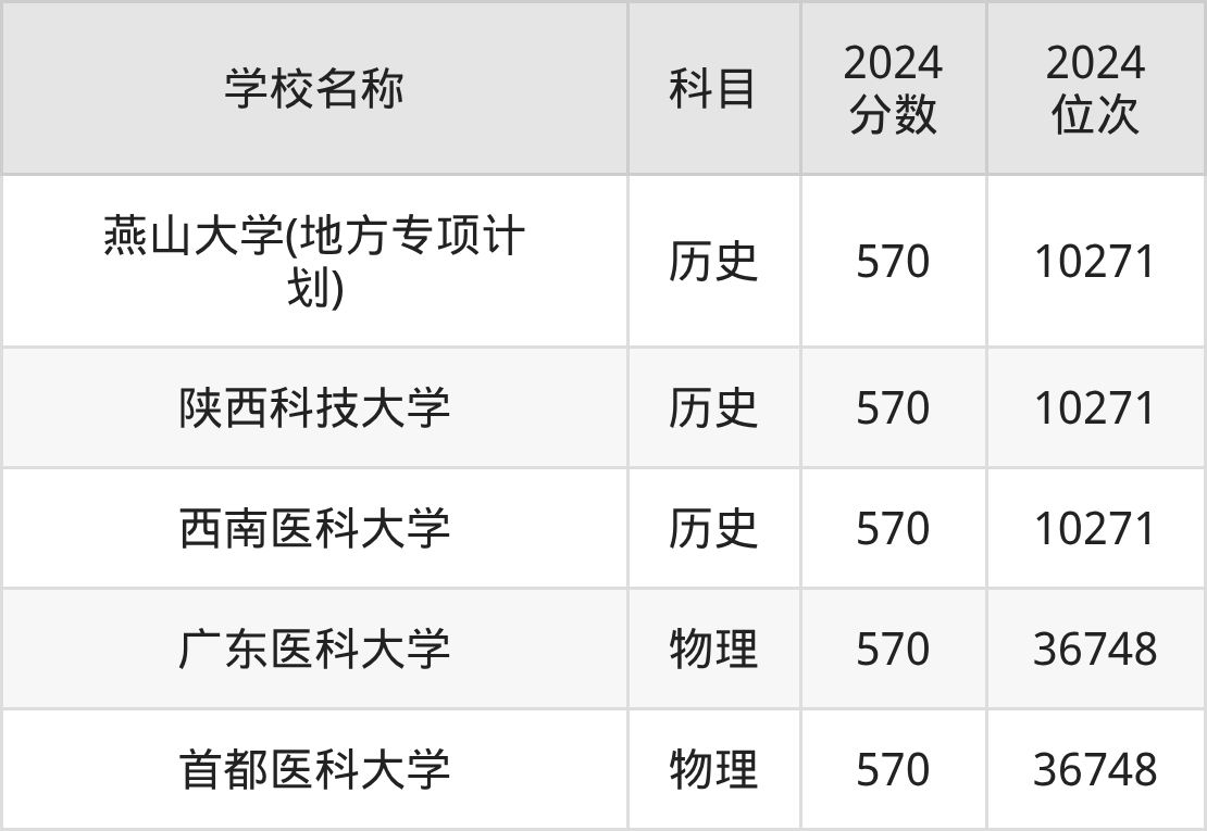 其中,物理组570分位于北京的学校有首都医科大学。历史组570分位于北京的学校有燕山大学(地方专项计划)。