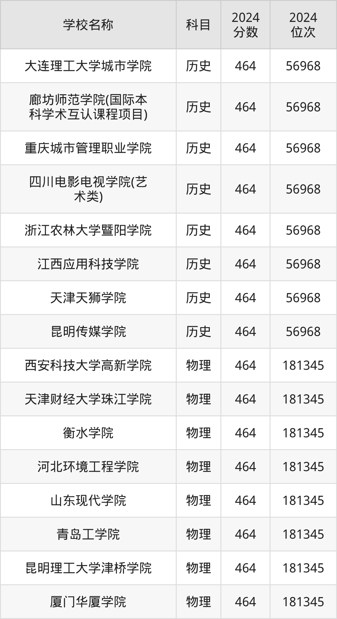 回看2024年河北高考最低分为464分的二本大学名单,物理组有8条数据,历史组有8条数据。
