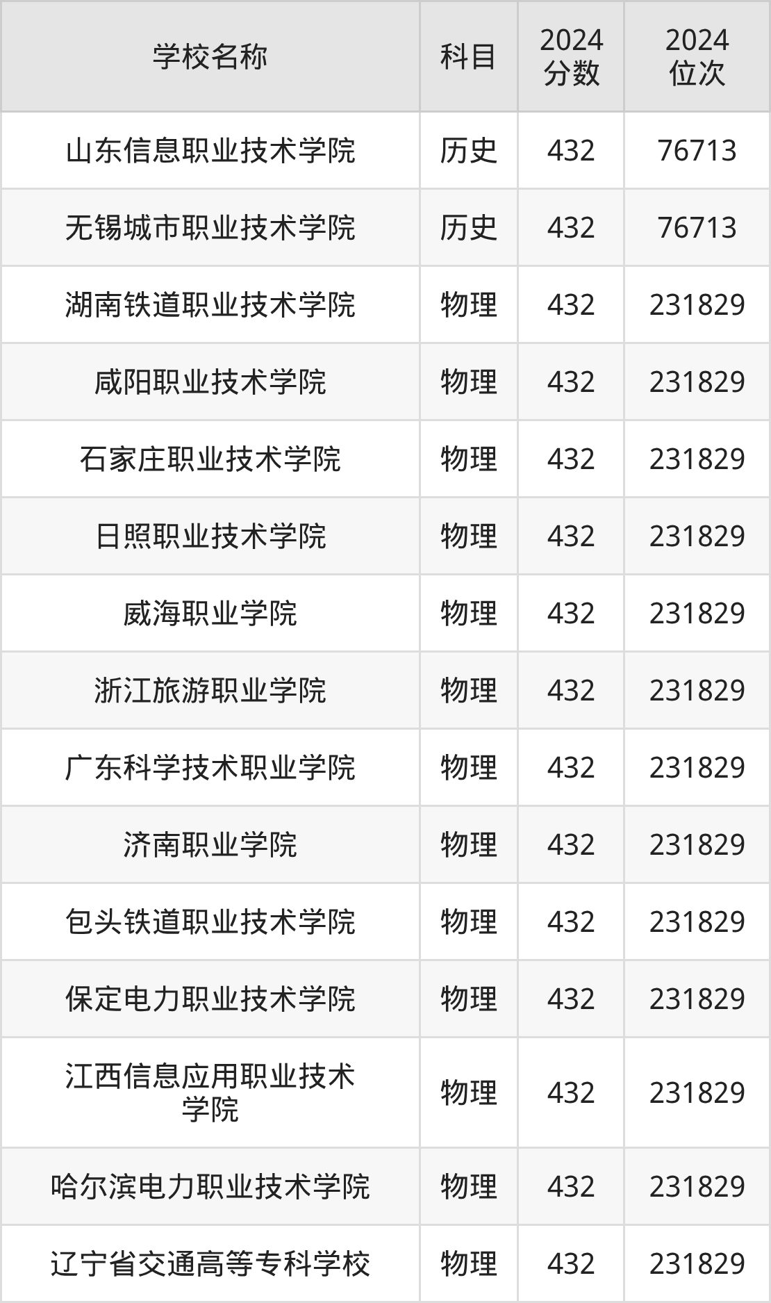 其中,物理组432分位于江苏的学校有石家庄职业技术学院、保定电力职业技术学院。历史组432分位于江苏的学校有无锡城市职业技术学院。