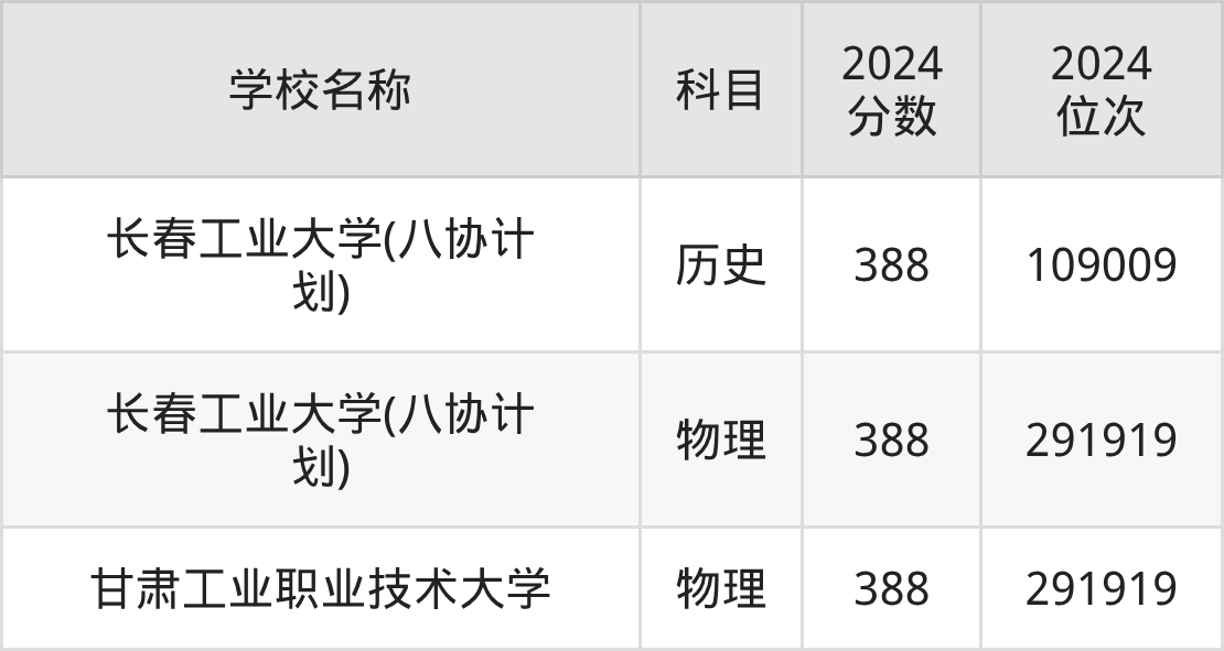 其中,物理组388分位于吉林的学校有长春工业大学(八协计划)。历史组388分位于吉林的学校有长春工业大学(八协计划)。