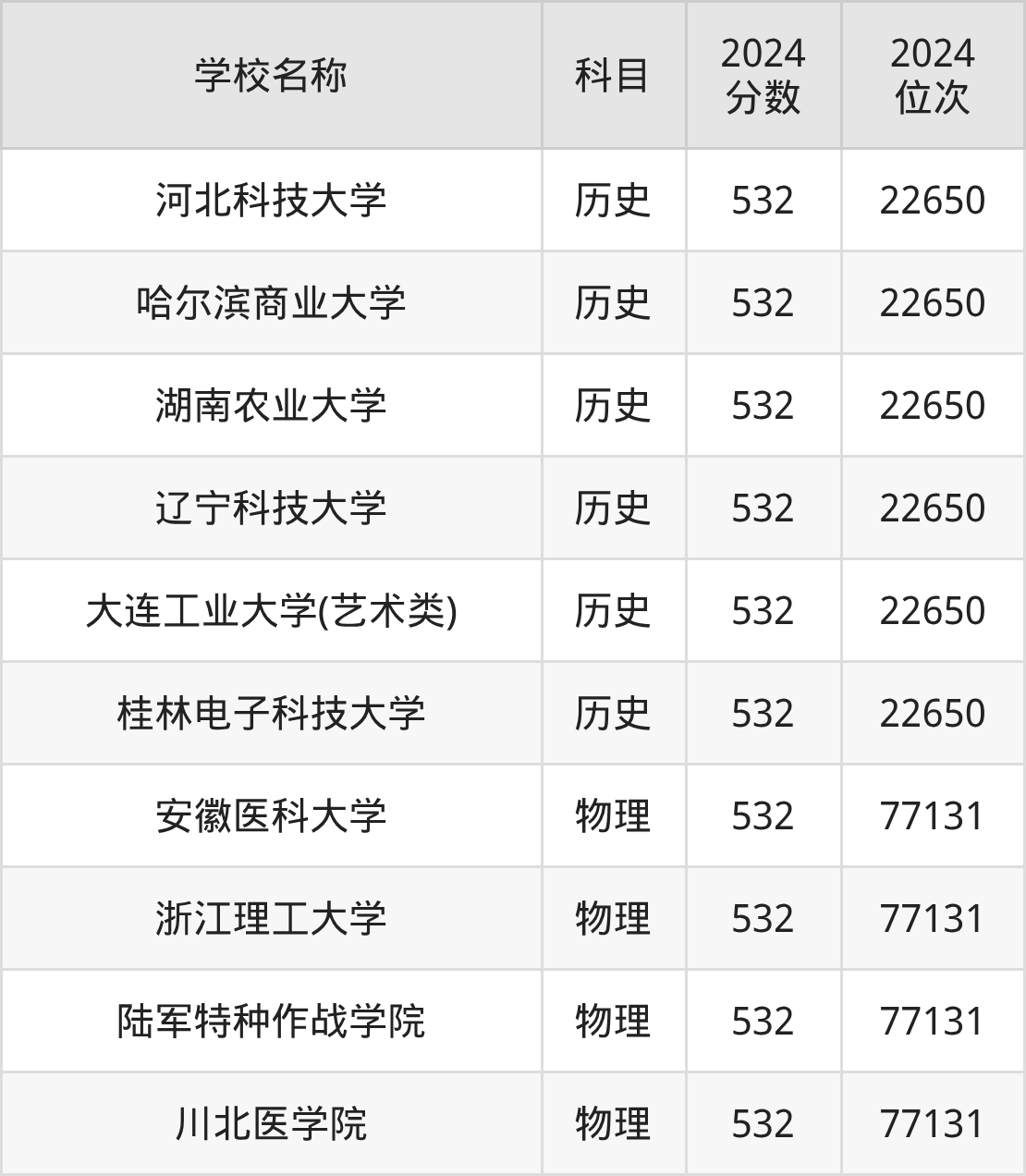 回看2024年河北高考最低分为532分的理科大学名单,物理组有4条数据,历史组有6条数据。