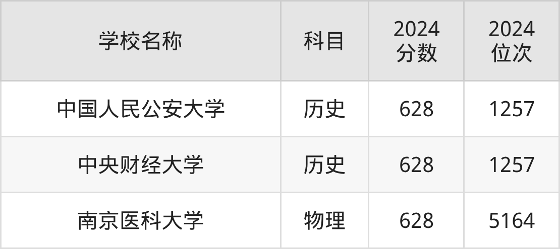 其中,物理组628分位于江苏的学校有南京医科大学。历史组628分位于江苏的学校有中国人民公安大学、中央财经大学。