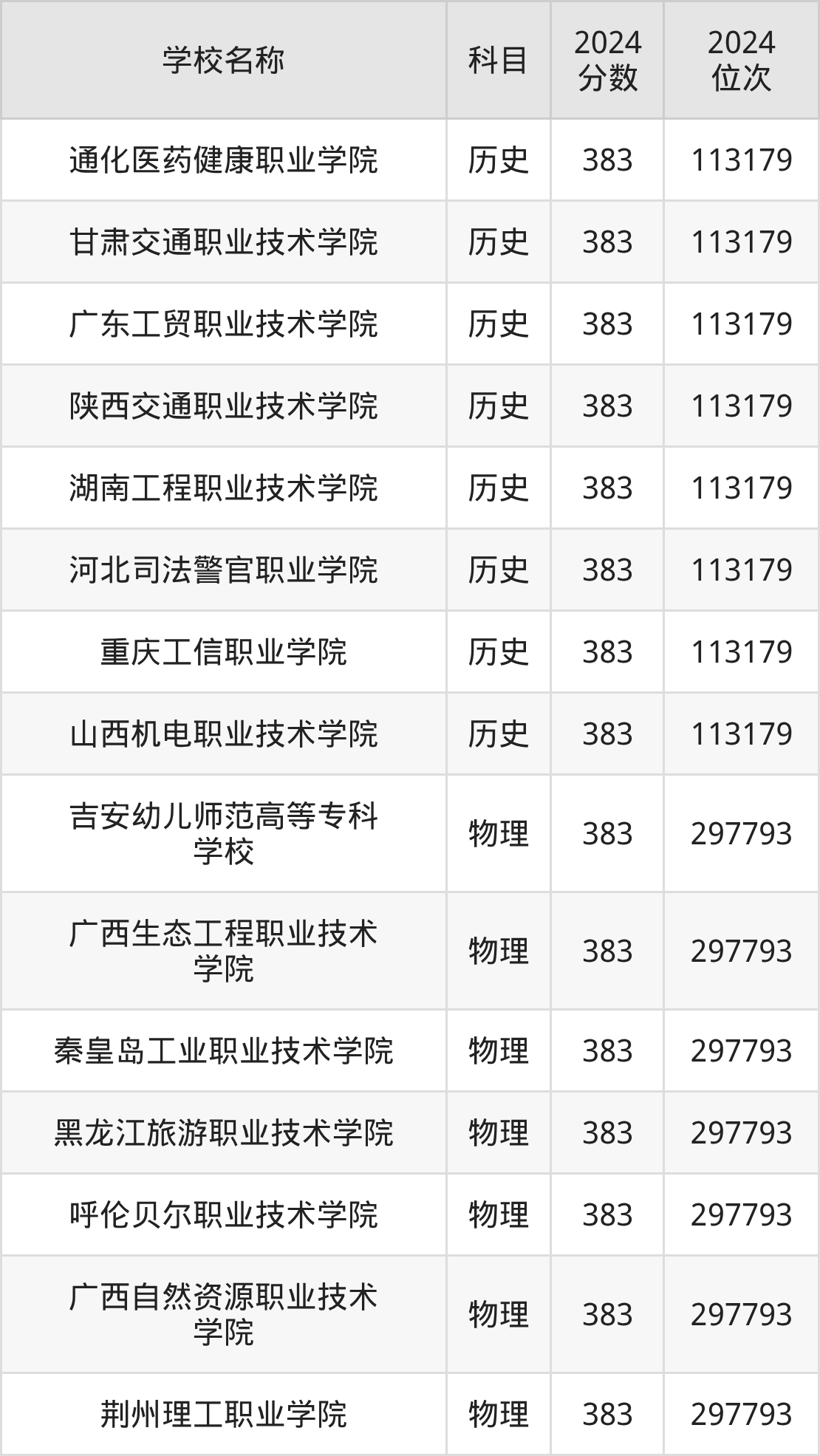回看2024年河北高考最低分为383分的公办大专学校名单,物理组有7条数据,历史组有8条数据。