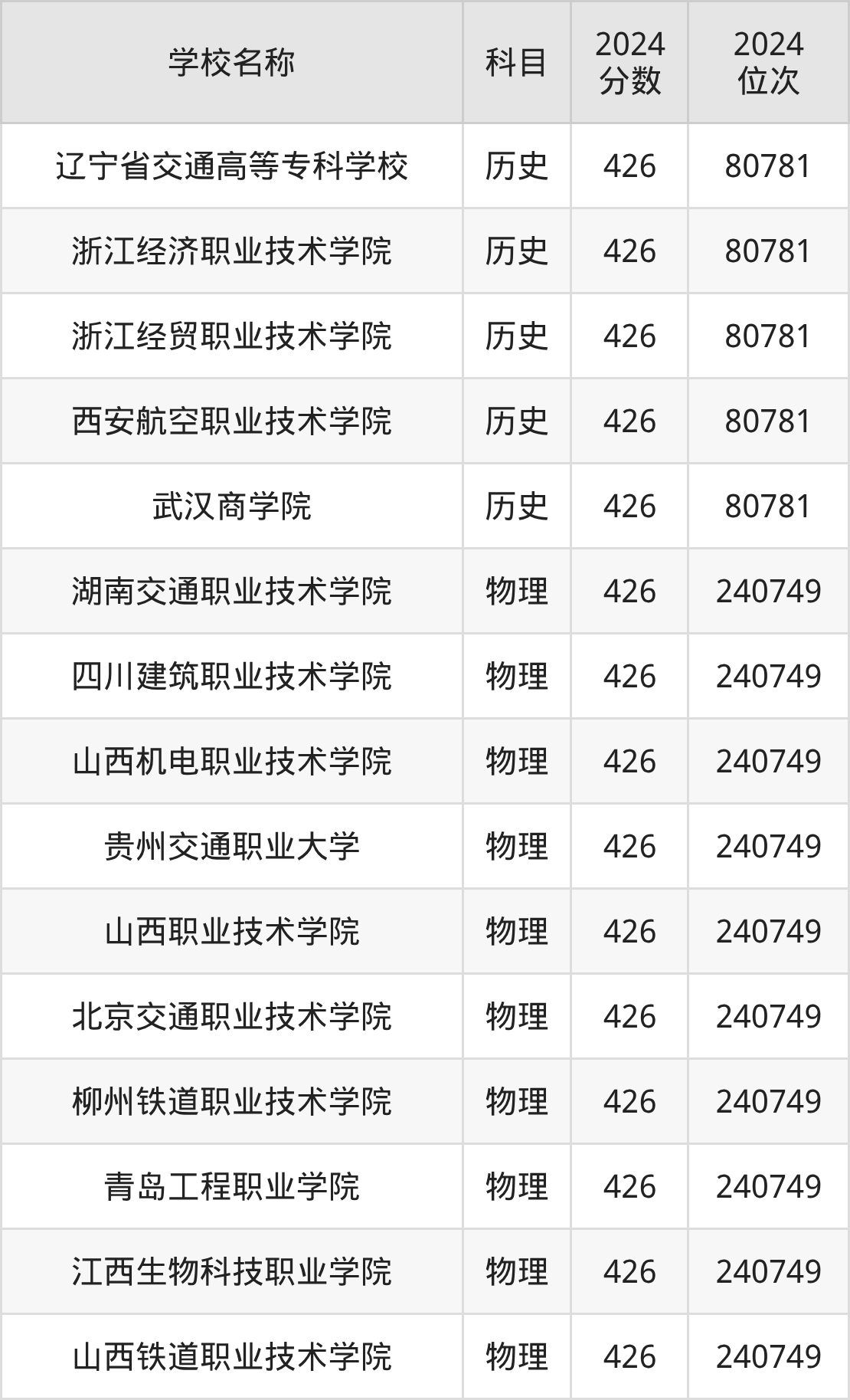 其中,物理组426分位于浙江的学校有北京交通职业技术学院。历史组426分位于浙江的学校有浙江经济职业技术学院、浙江经贸职业技术学院。