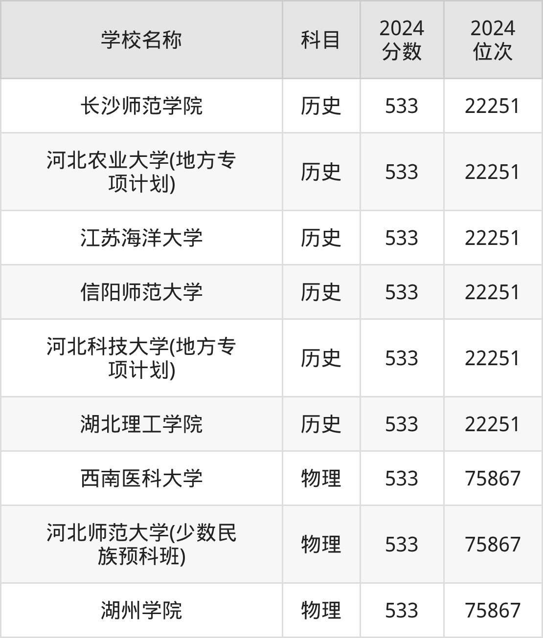 其中,物理组533分位于河北的学校有河北师范大学(少数民族预科班)。历史组533分位于河北的学校有河北农业大学(地方专项计划)、河北科技大学(地方专项计划)。