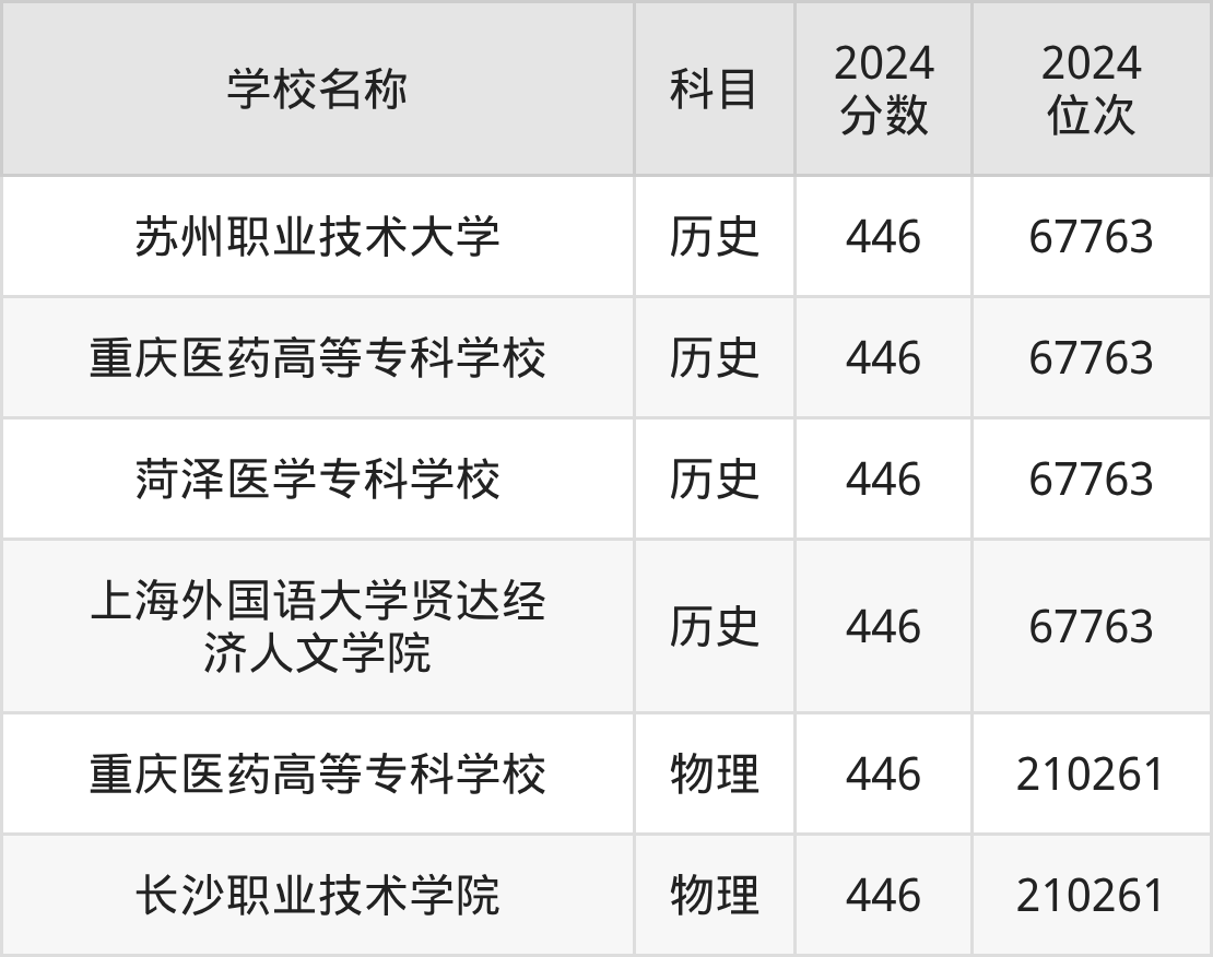 其中,物理组446分位于重庆的学校有重庆医药高等专科学校。历史组446分位于上海的学校有上海外国语大学贤达经济人文学院。