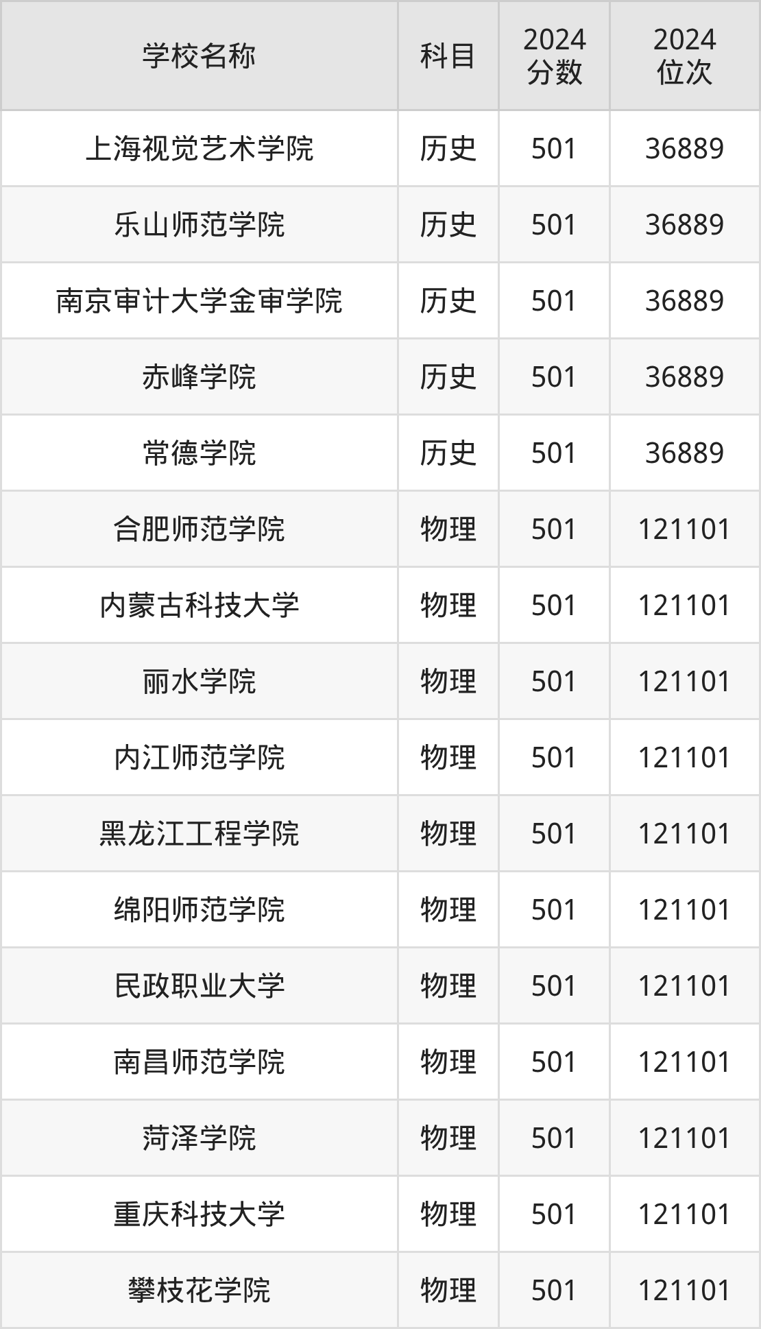 其中,物理组501分位于上海的学校有民政职业大学。历史组501分位于上海的学校有上海视觉艺术学院。