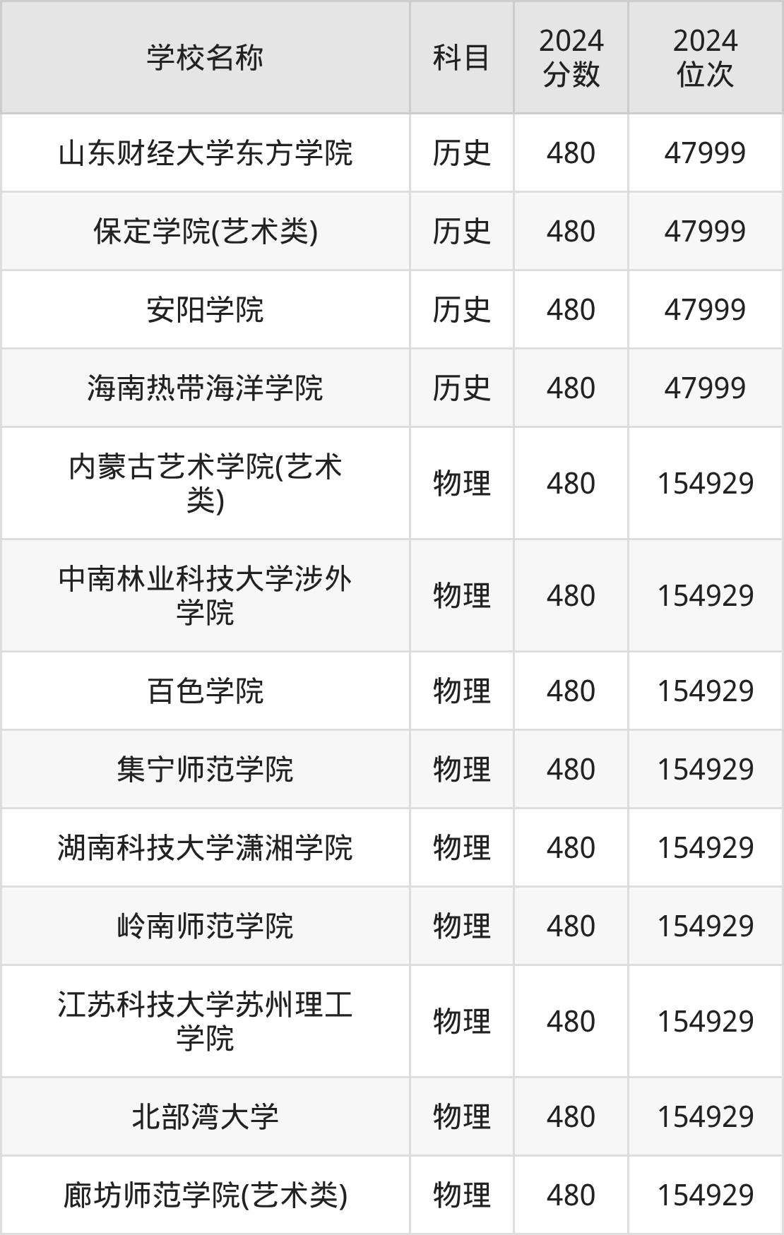回看2024年河北高考最低分为480分的文科大学名单,物理组有9条数据,历史组有4条数据。