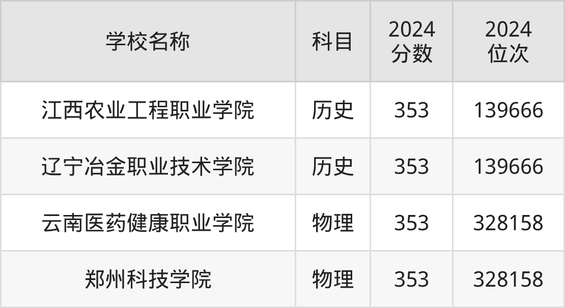 其中,物理组353分位于云南的学校有云南医药健康职业学院。历史组353分位于江西的学校有江西农业工程职业学院。