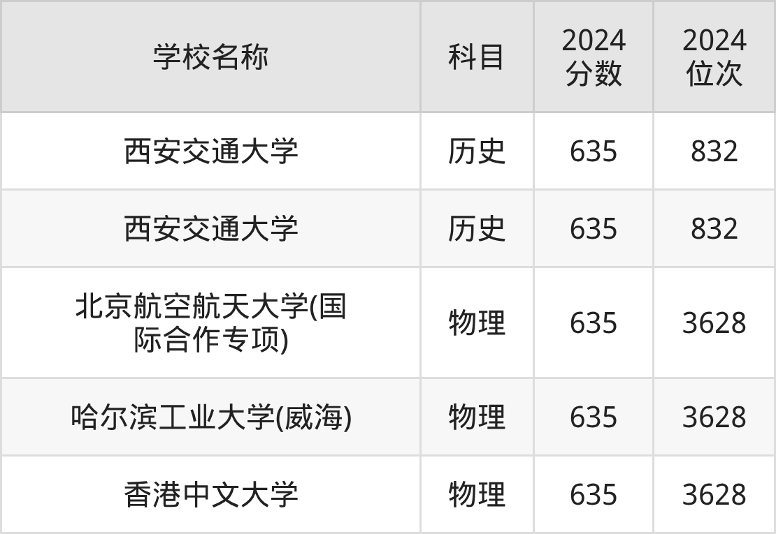 其中,物理组635分位于北京的学校有北京航空航天大学(国际合作专项)。历史组635分位于陕西的学校有西安交通大学。