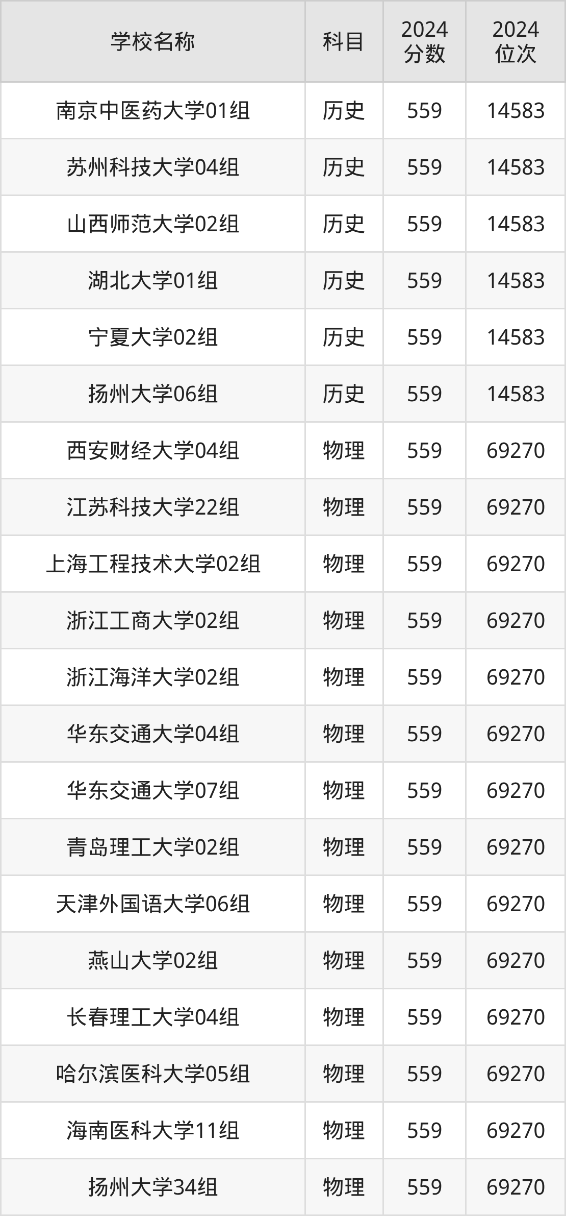 其中,物理组559分位于江苏的学校有江苏科技大学、扬州大学、常州大学。历史组559分位于江苏的学校有南京中医药大学、苏州科技大学、扬州大学。