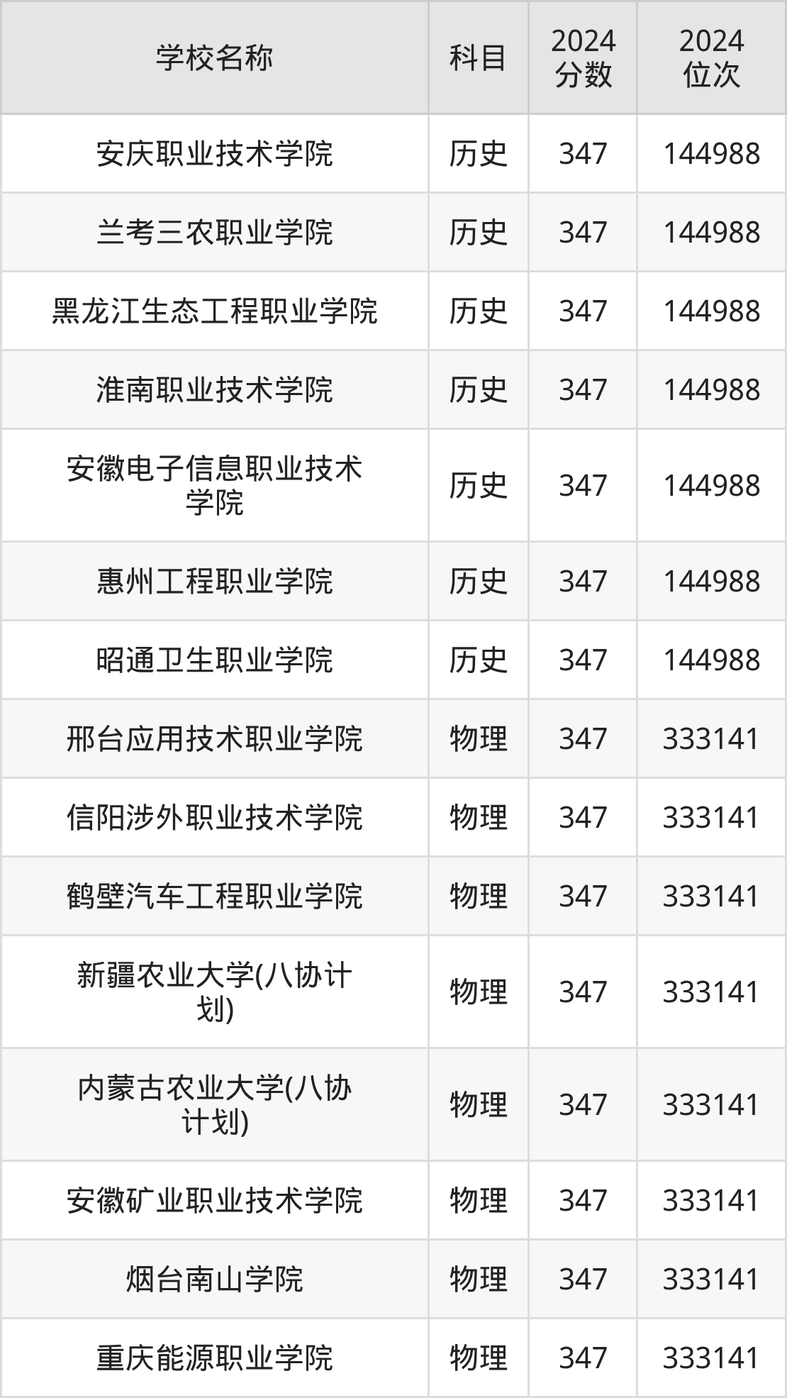 其中,物理组347分位于广东的学校有邢台应用技术职业学院。历史组347分位于广东的学校有惠州工程职业学院。