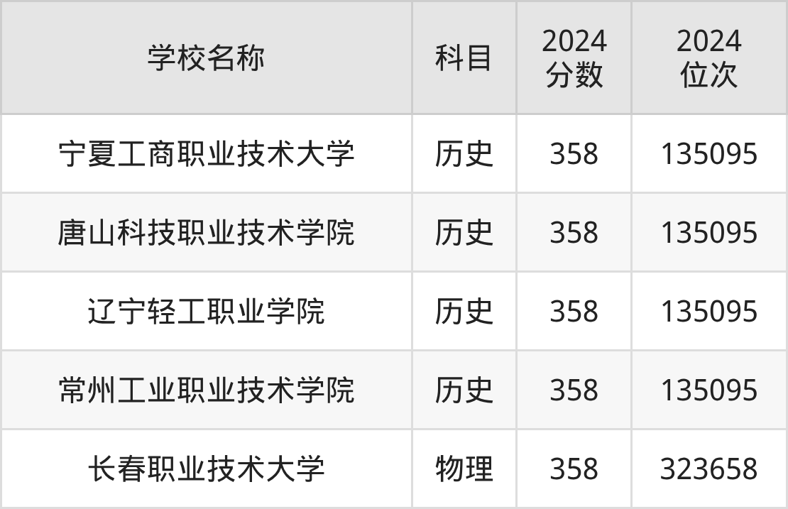 其中,物理组358分位于吉林的学校有长春职业技术大学。历史组358分位于河北的学校有唐山科技职业技术学院。