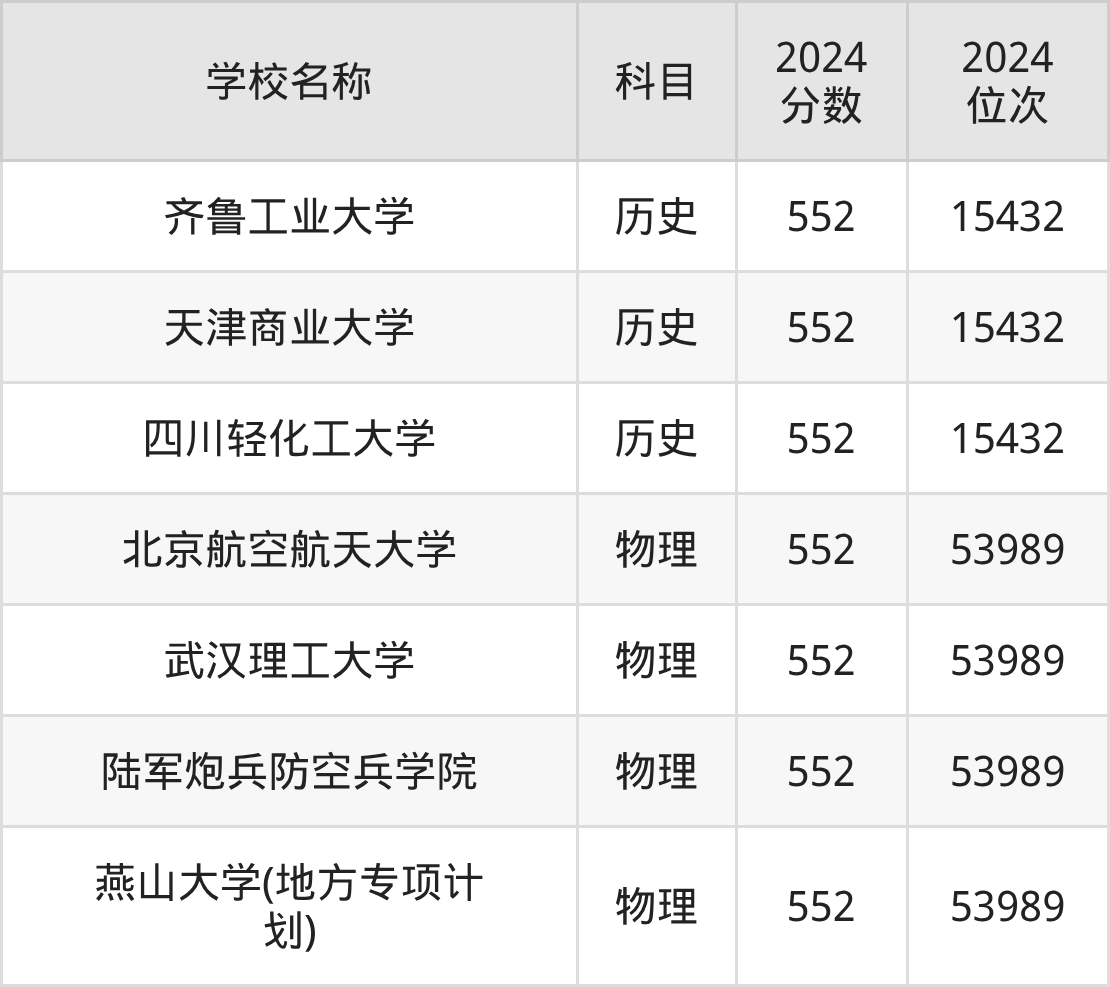其中,物理组552分位于河北的学校有燕山大学(地方专项计划)。历史组552分位于山东的学校有齐鲁工业大学。