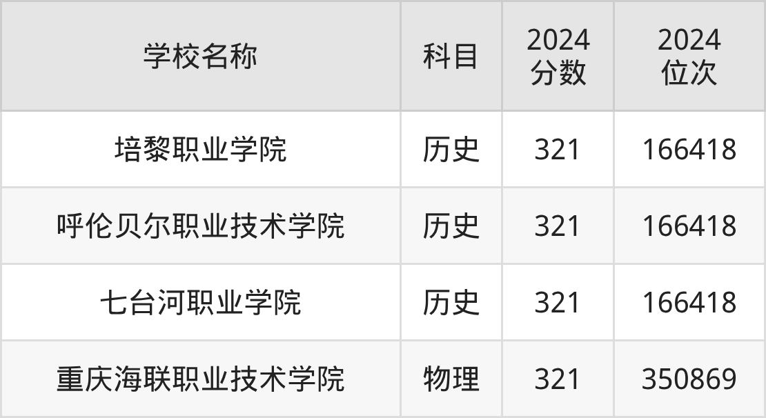 其中,物理组321分位于重庆的学校有重庆海联职业技术学院。历史组321分位于甘肃的学校有培黎职业学院。