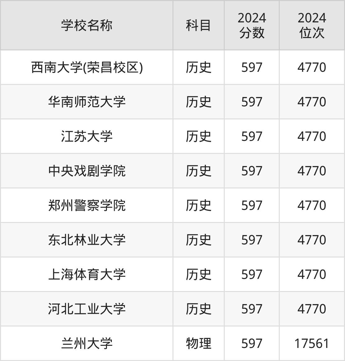 其中,物理组597分位于甘肃的学校有兰州大学。历史组597分位于北京的学校有中央戏剧学院。