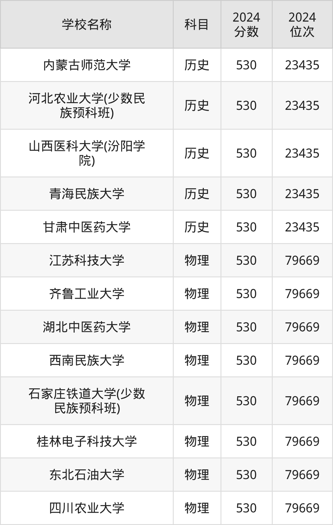 | 河北大学(少数民族预 科班) | 物理 | 530 | 66510 |