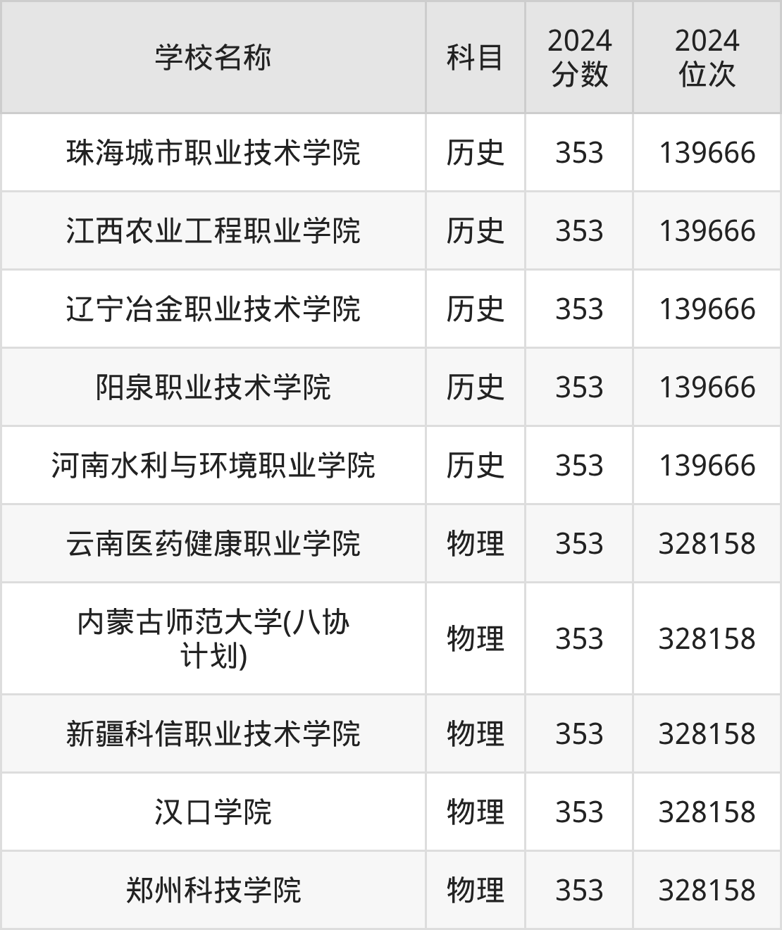 其中,物理组353分位于云南的学校有云南医药健康职业学院。历史组353分位于广东的学校有珠海城市职业技术学院。