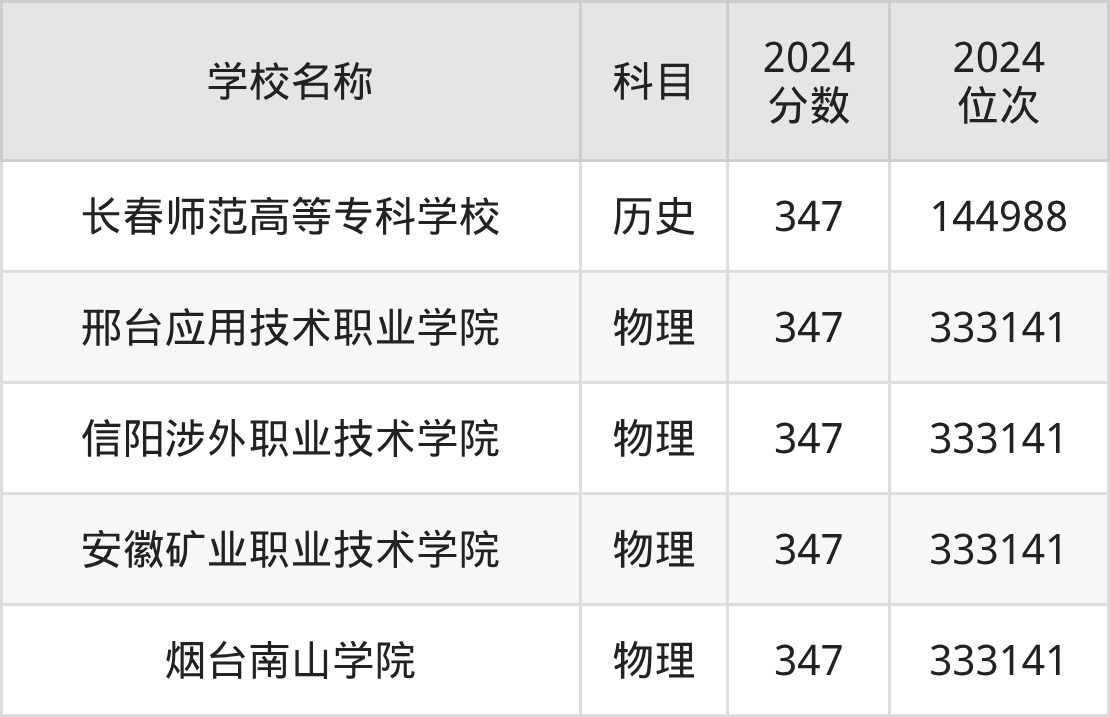 其中,物理组347分位于河北的学校有邢台应用技术职业学院。历史组347分位于吉林的学校有长春师范高等专科学校。