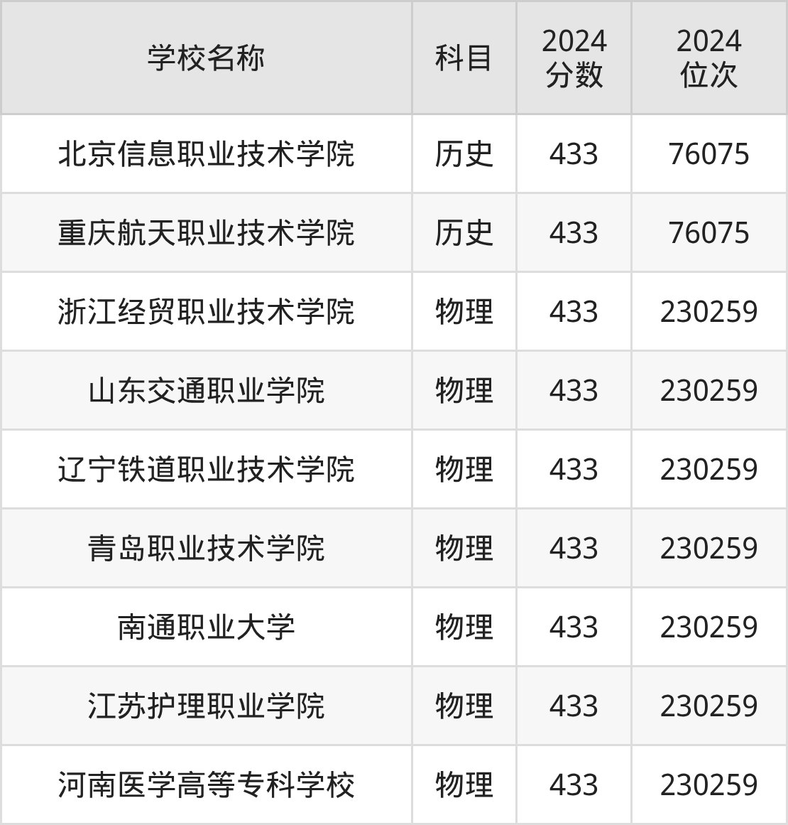 其中,物理组433分位于浙江的学校有浙江经贸职业技术学院。历史组433分位于浙江的学校有北京信息职业技术学院。