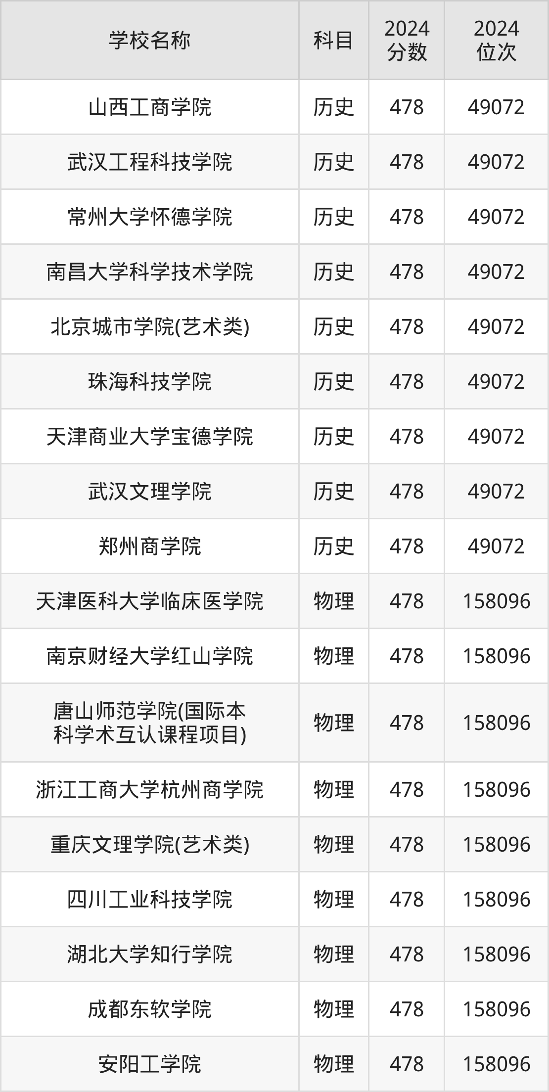 回看2024年河北高考最低分为478分的二本大学名单,物理组有9条数据,历史组有9条数据。
