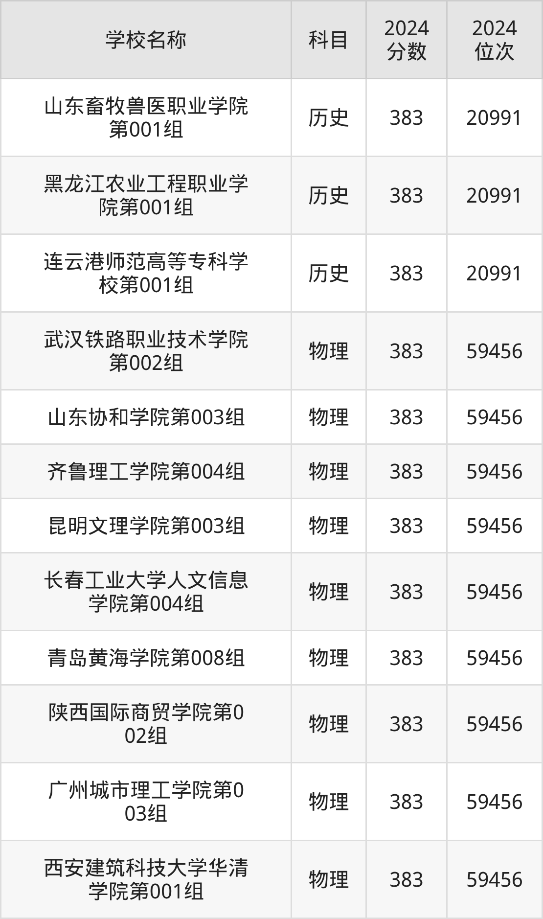 其中,物理组383分位于江苏的学校有长春工业大学人文信息学院。历史组383分位于江苏的学校有连云港师范学院。