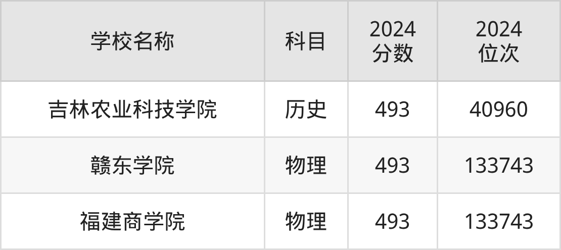 其中,物理组493分位于江西的学校有赣东学院。历史组493分位于吉林的学校有吉林农业科技学院。