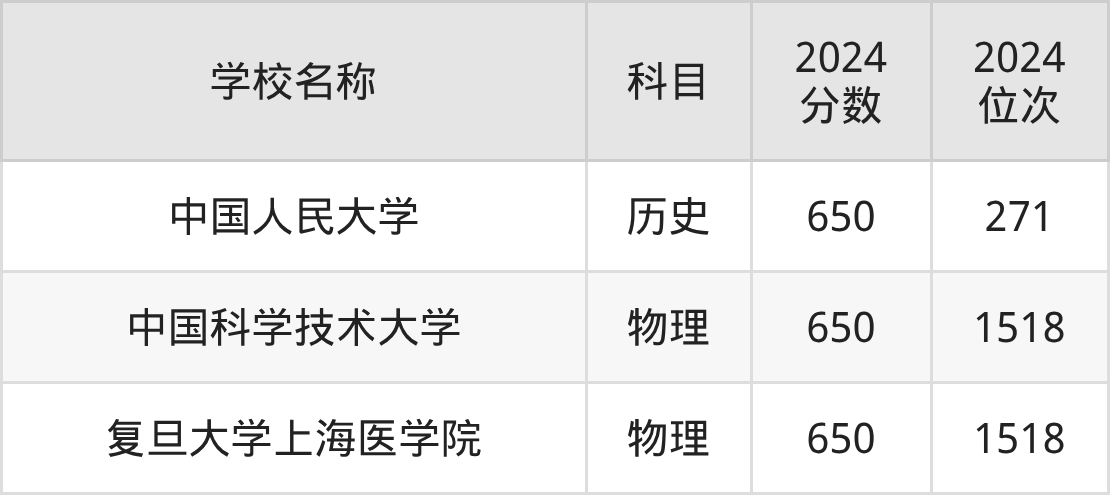 其中,物理组650分位于上海的学校有复旦大学上海医学院。历史组650分位于上海的学校有中国人民大学。