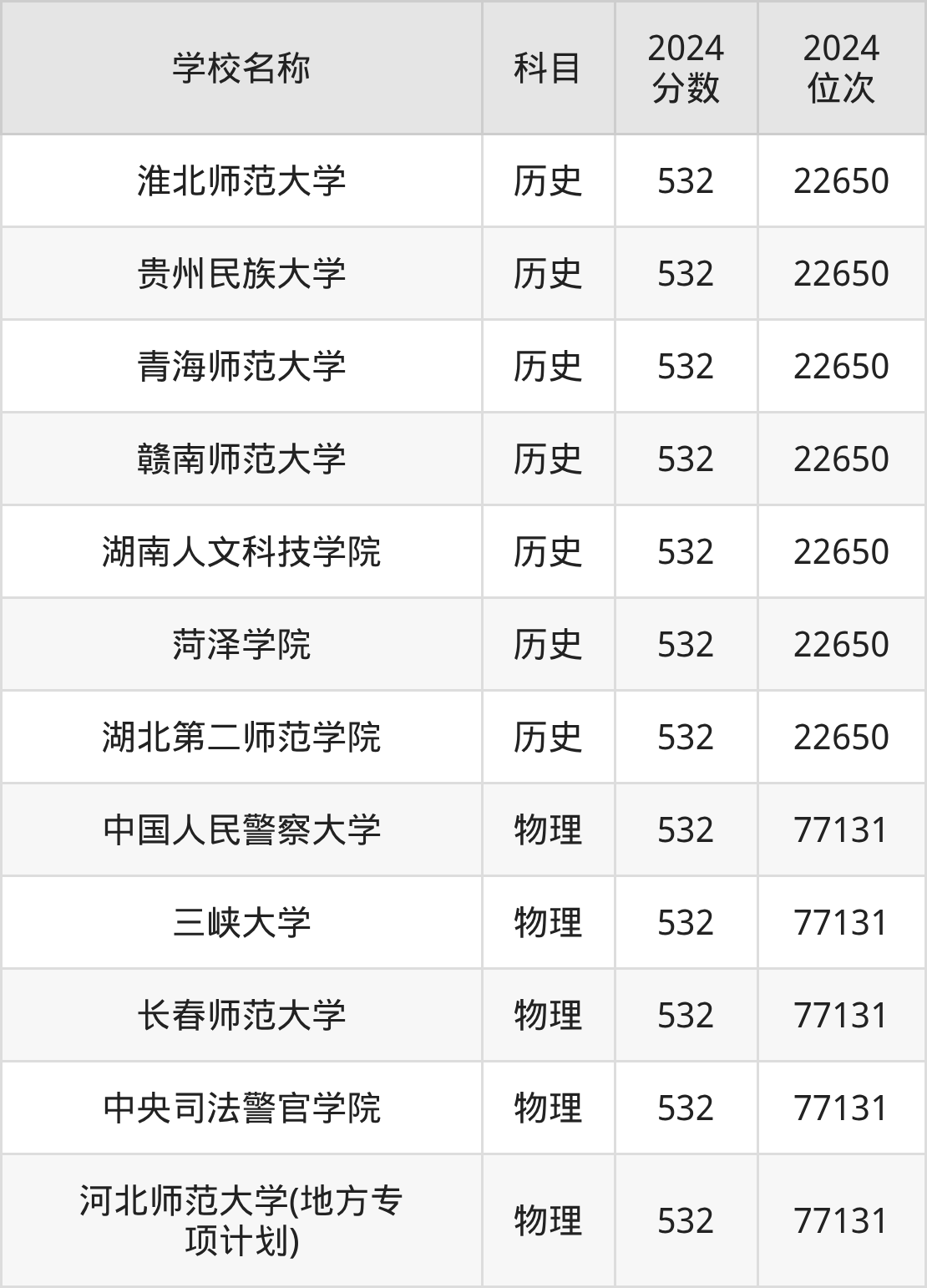其中,物理组532分位于河北的学校有中国人民警察大学。历史组532分位于安徽的学校有淮北师范大学。
