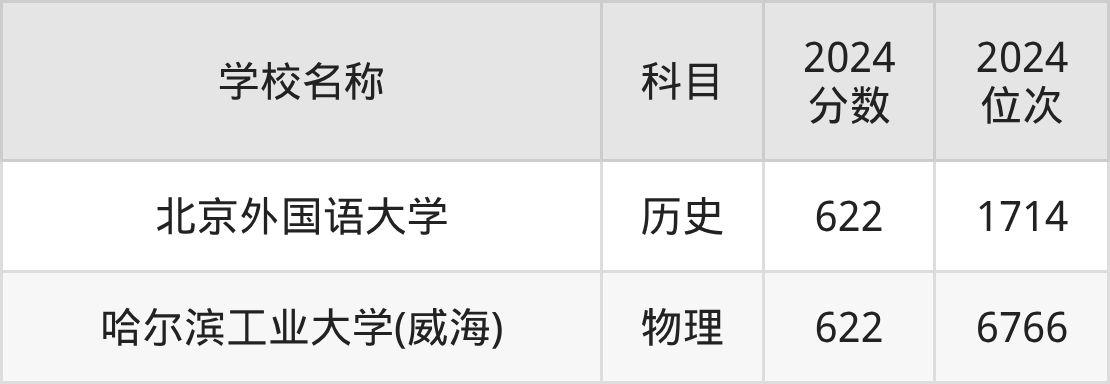 其中,物理组622分位于山东的学校有哈尔滨工业大学(威海)。历史组622分位于北京的学校有北京外国语大学。