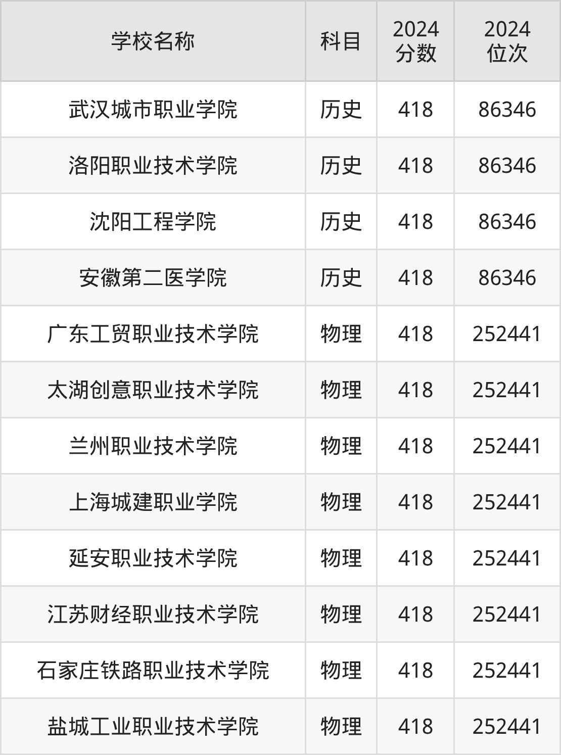 其中,物理组418分位于河北的学校有石家庄铁路职业技术学院。历史组418分位于湖北的学校有武汉城市职业学院。