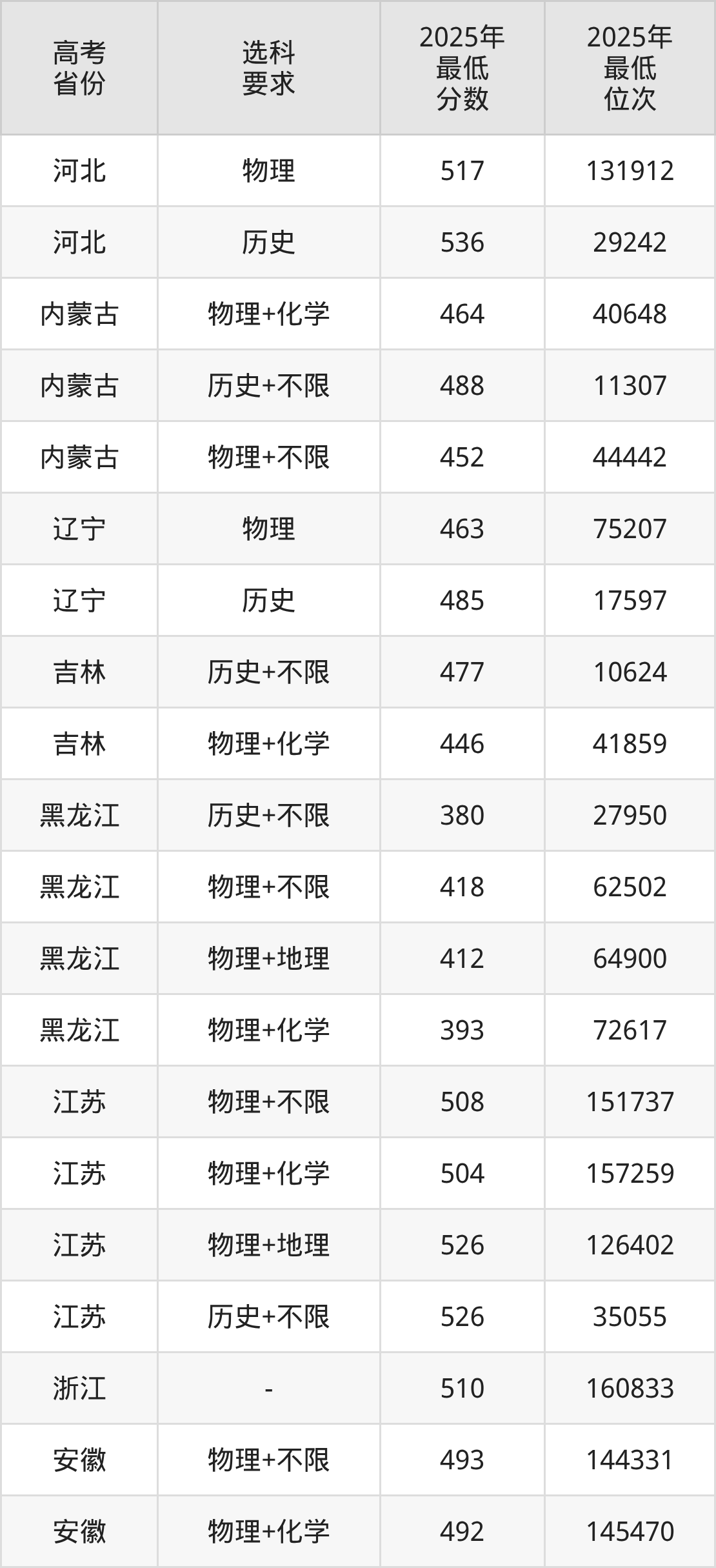 在2025年黑龙江高考物理类招生时,211收分最低的是郑州大学第003组,最低分是389分、位次是74217位。再看黑龙江工程学院,2025年在黑龙江物理类的最低录取分数线是393分,最低位次是72617位。