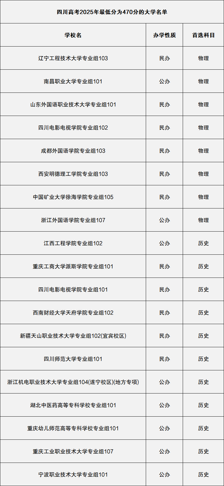 附四川高考2025年最低分为470分的全部院校名单一览表图片: